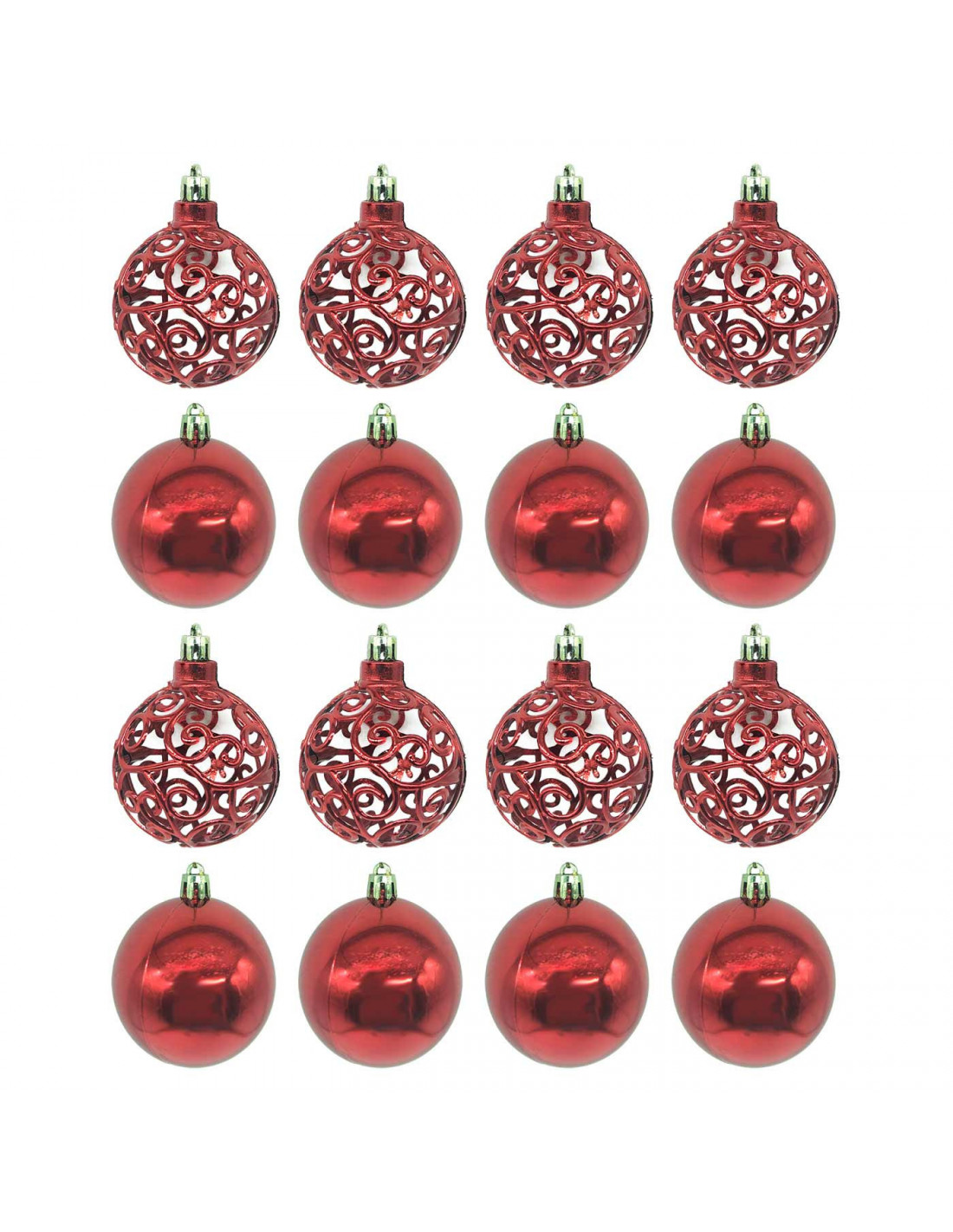 - Set completo: Incluye 16 bolas navideñas, con 8 brillantes y 8 huecas decoradas con un diseño de ramas circulares.