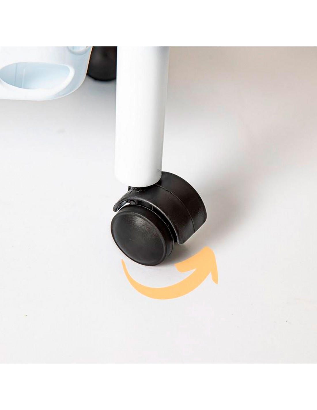 - Está diseñado en color blanco y equipado con ruedas para facilitar su desplazamiento y adaptarse a distintas necesidades.
