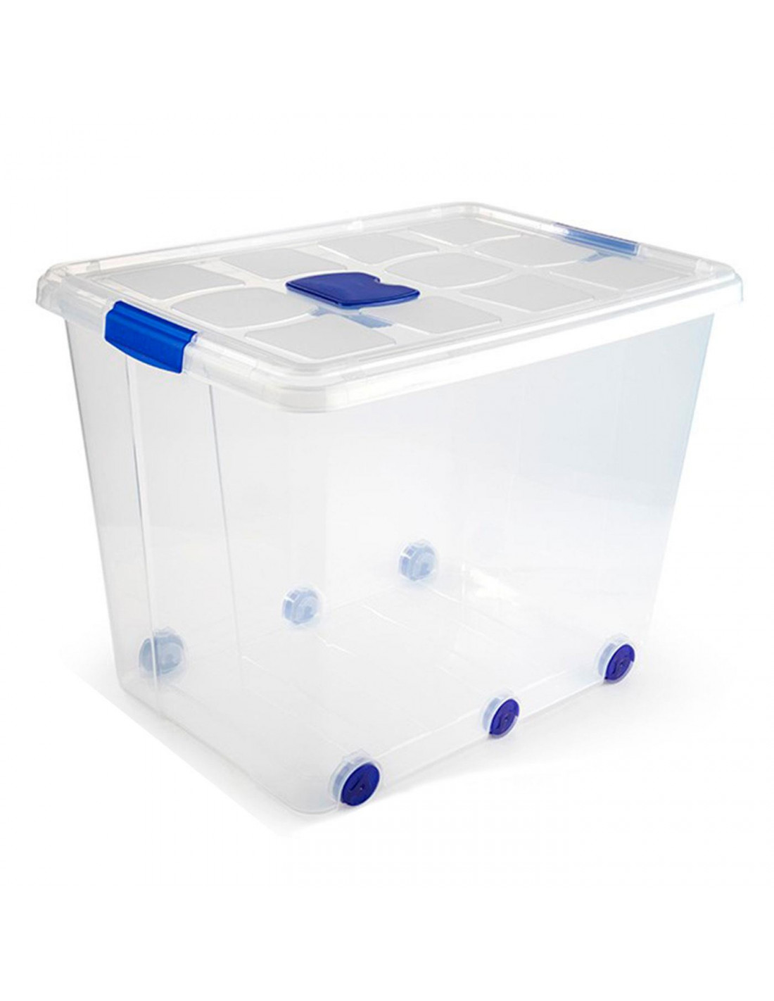 Tradineur - Caja de plástico transparente de 61,5 x 44 x 46,5 cm, con capacidad de 86 litros, Contenedor de plástico para almacenamiento con tapa y ruedas válida para interior y exterior.