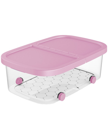 Tradineur - Caja de almacenamiento con ruedas y tapa con doble abertura, plástico, contenedor, juguetes, libros, ropa, mantas, fabricada en España (Rosa - 32 litros - 59 x 39 x 20 cm)