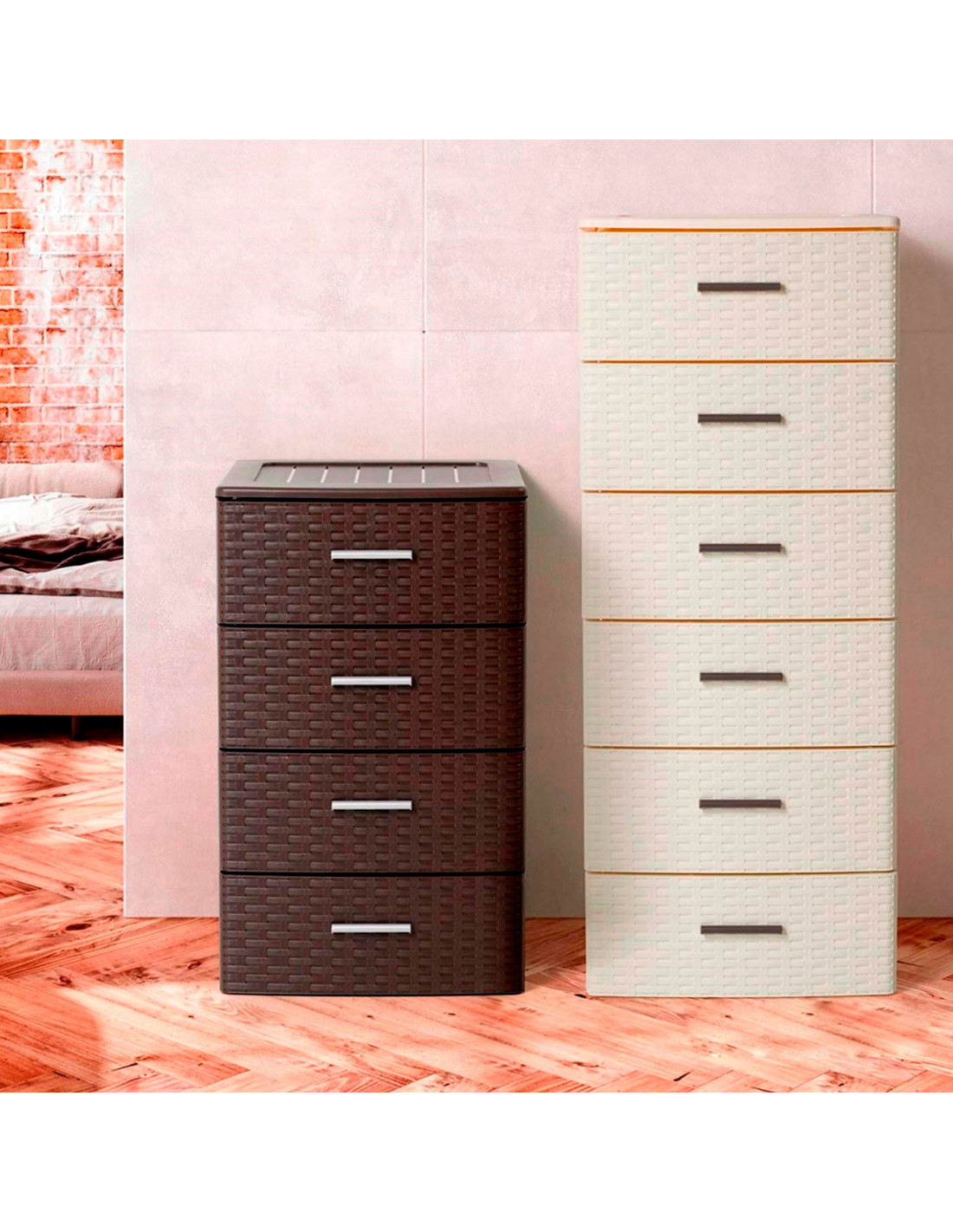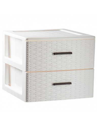 Si necesitas espacio de almacenamiento en el baño o dormitorio, te vendrá muy bien esta cajonera de plástico modelo "Rattan" con un precioso diseño con efecto mimbre. Es de color blanco roto y cuenta con 2 cajones. Podrás guardar en ella todo tipo de objetos y tenerlos siempre a mano.