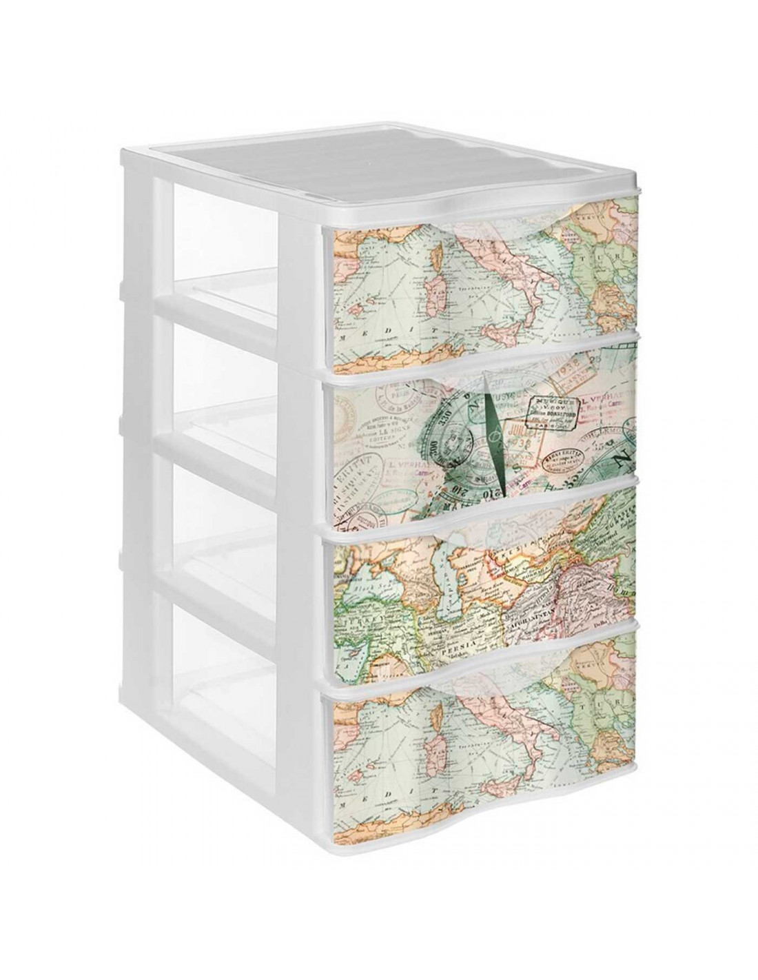 Preciosa cajonera infantil de 4 cajones modelo Mapamundi. Sus múltiples cajones permiten guardar varias cosas por separado y clasificarlas por tipo; y al ser transparentes también facilitan encontrar las cosas. No solo sirve para almacenar artículos de papelería, sino también para guardar juguetes, ropa, etc. Ideal para colocar en la sala de estar, dormitorio o estudio.