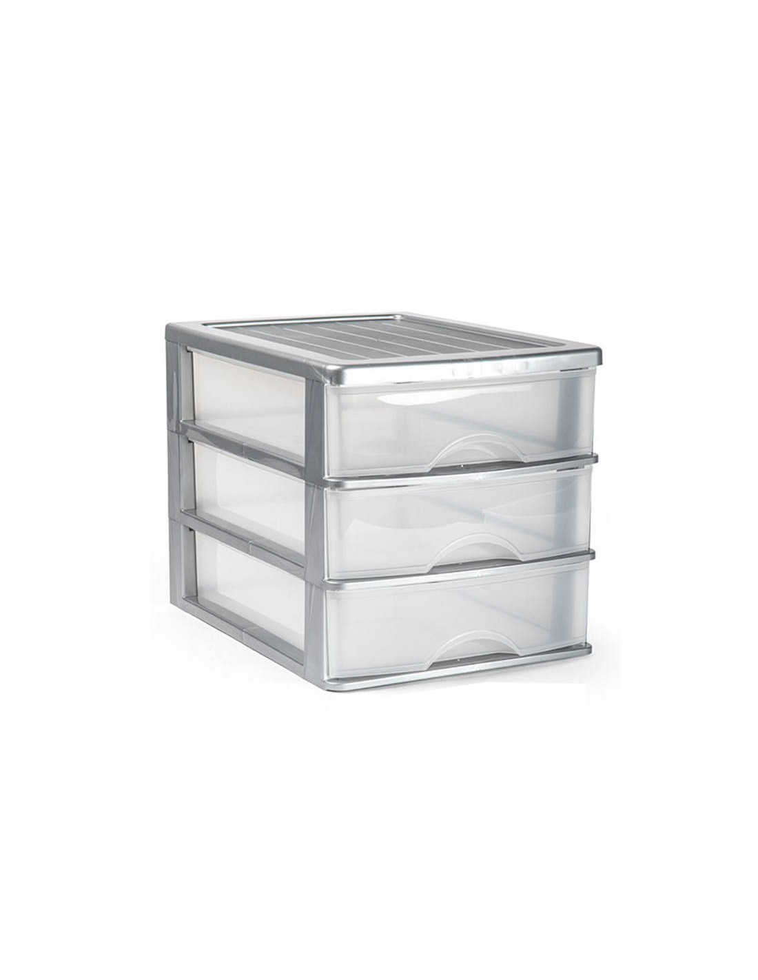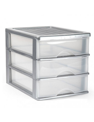 Tradineur - Cajonera de sobremesa 3 cajones de color plata de 26,8 x 27 x 35,5 cm, Cajonera plástico 3 cajones para mesa multiusos para almacenamiento y organización ideal para oficina.