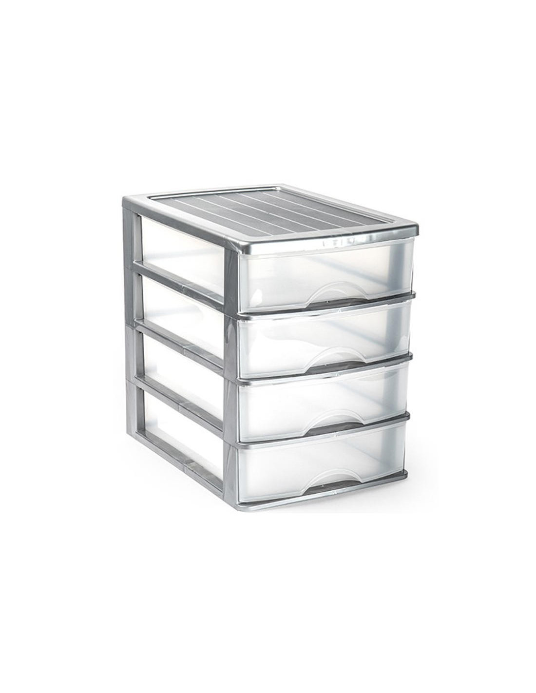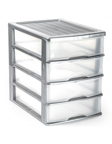 Tradineur - Cajonera de sobremesa 4 cajones de color plata de 35,3 x 26,5 x 35,3 cm, Cajonera plástico 4 cajones para mesa multiusos para almacenamiento y organización ideal para oficina.