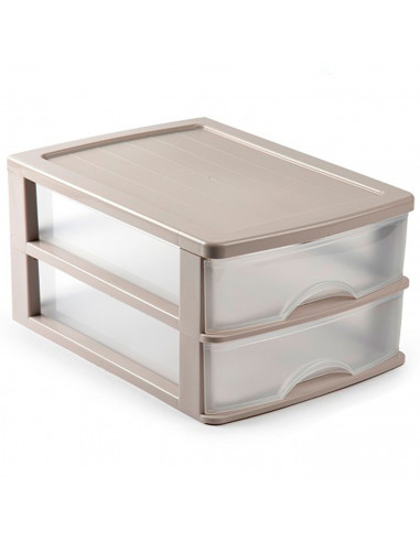 Con esta práctica cajonera de sobremesa con 2 cajones podrás mantener todo en orden fácilmente. Está fabricada en plástico resistente y de gran calidad. La estructura es en color marrón claro y los cajones son transparentes. Es perfecta para guardar objetos pequeños en negocios, oficinas y hogares particulares y su pequeño tamaño hace que se pueda colocar encima de mesas o escritorios, dentro de armarios, etc.