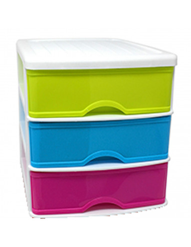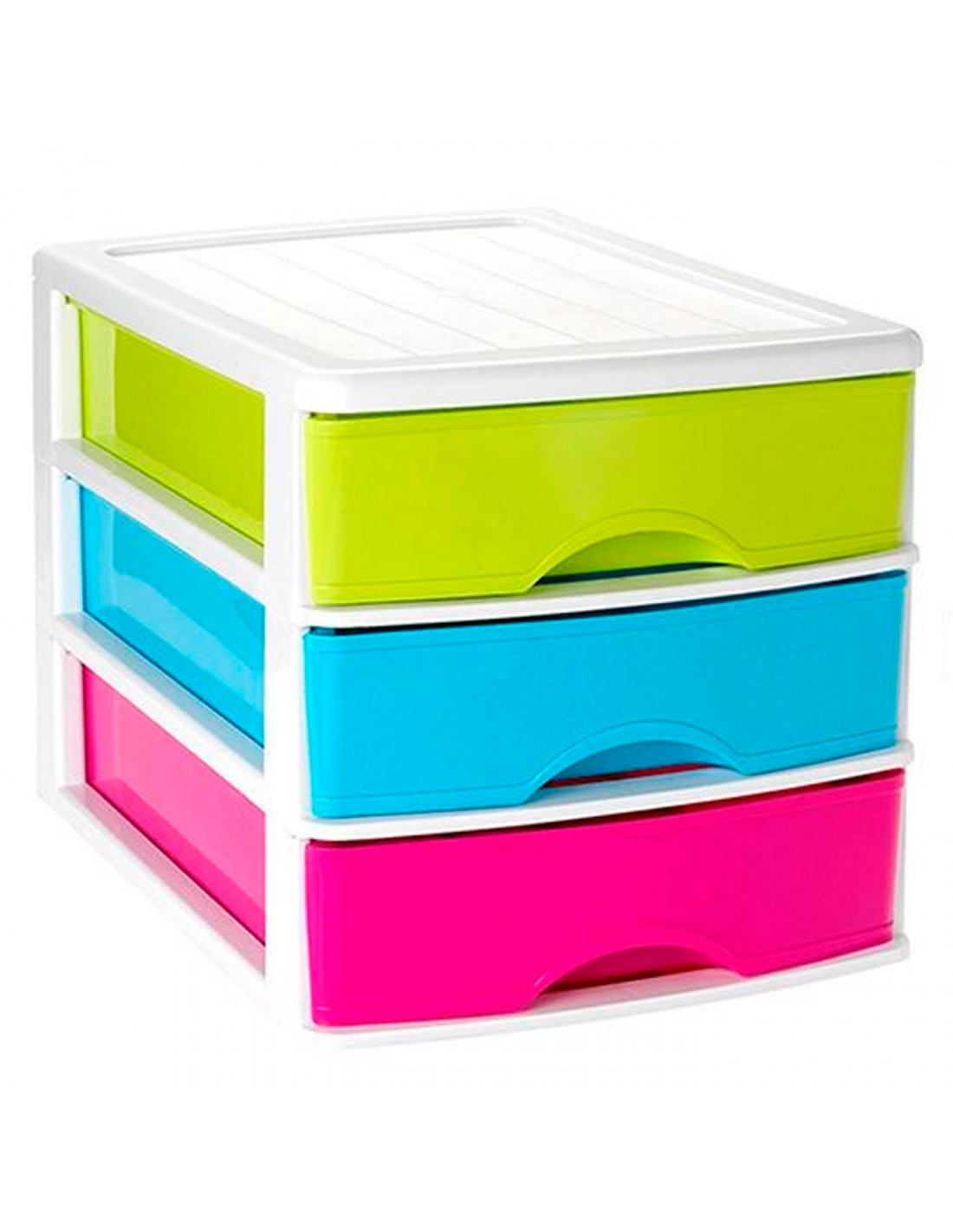 Con esta práctica cajonera de sobremesa con 3 cajones podrás mantener todo en orden fácilmente. Está fabricada en plástico resistente y de gran calidad. La estructura es en color blanco y los cajones son multicolor. Es perfecta para guardar objetos pequeños en negocios, oficinas y hogares particulares y su pequeño tamaño hace que se pueda colocar encima de mesas o escritorios, dentro de armarios, etc.