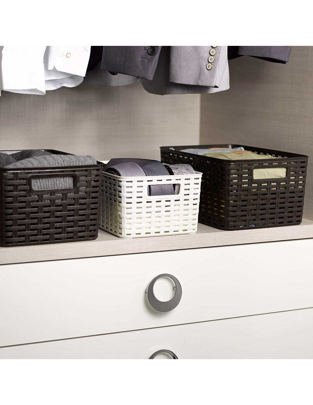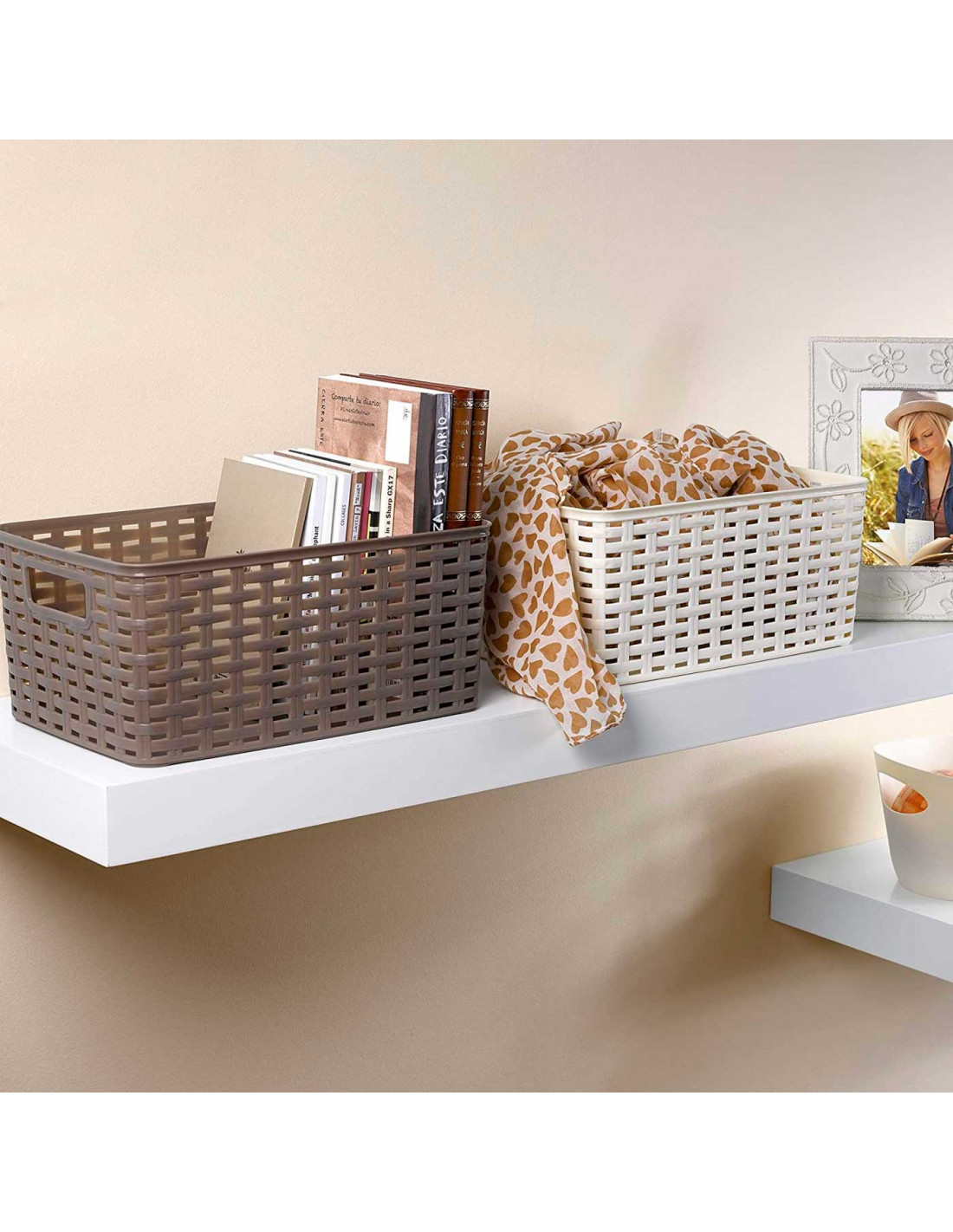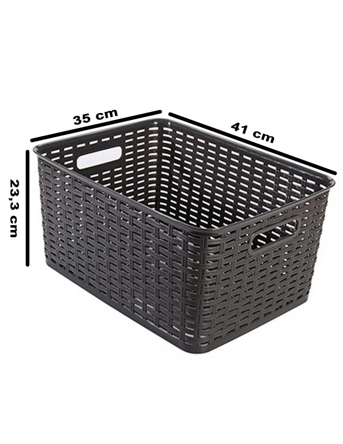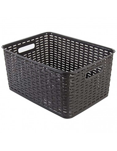 Cesta organizadora rectangular de color marrón wengué modelo "Rattan" muy práctica para almacenar y ordenar objetos del hogar como ropa, productos de limpieza, mantas, etc. Está fabricada en polipropileno de gran calidad y resistencia con un diseño trenzado que imita al mimbre. Sus asas laterales facilitan su transporte por lo que es también muy práctica para llevar la colada.