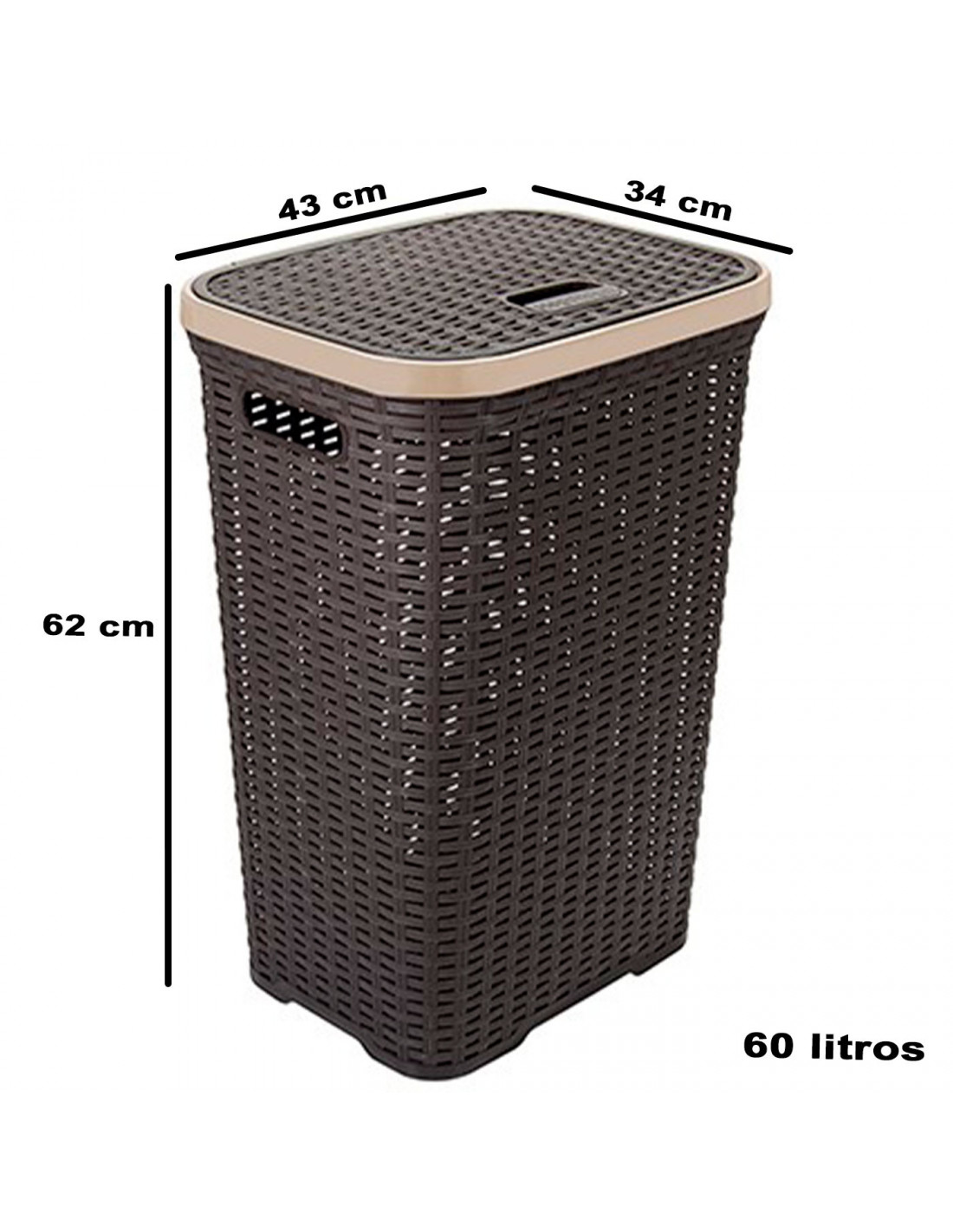 El cesto está fabricado en plástico polipropileno de gran calidad con un bonito diseño de imitación de mimbre y sus medidas aprox. son de 62 x 43 x 34 cm (alto x ancho x profundo).