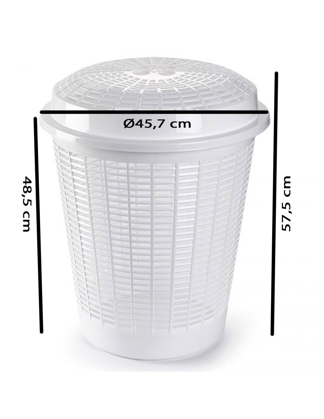 Este estupendo cesto redondo para la ropa sucia de color blanco te permitirá almacenar una gran cantidad de ropa sucia. Tiene tapa, es muy ligero y cuenta con una capacidad de 50 litros.