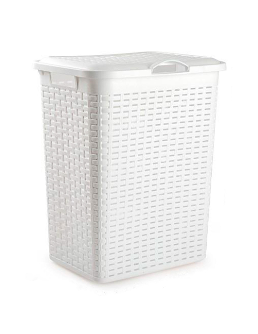 Tradineur - Cesto rattan para ropa sucia con tapa y asas, pongotodo de plástico, cubo para colada, imitación de mimbre, fabricado en España (Blanco - 38 litros - 49 x 38,5 x 29,5 cm)