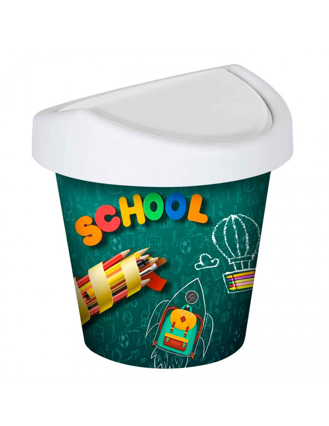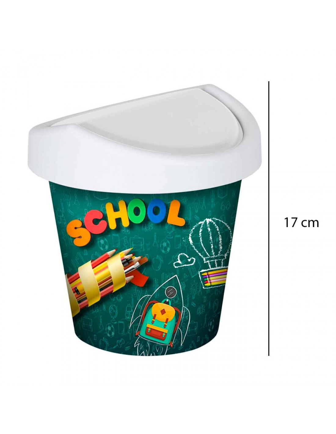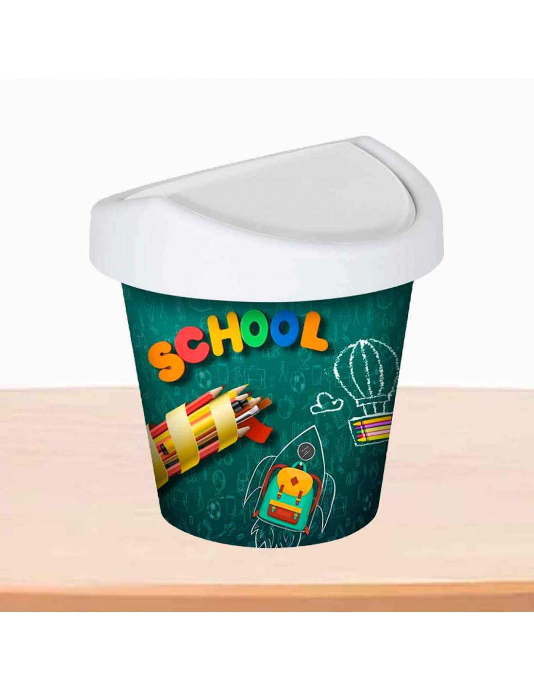 Mini papelera redonda con tapa giratoria de plástico con diseño de colegio. Oficina, escritorio, estudio. 17 x 16 cm