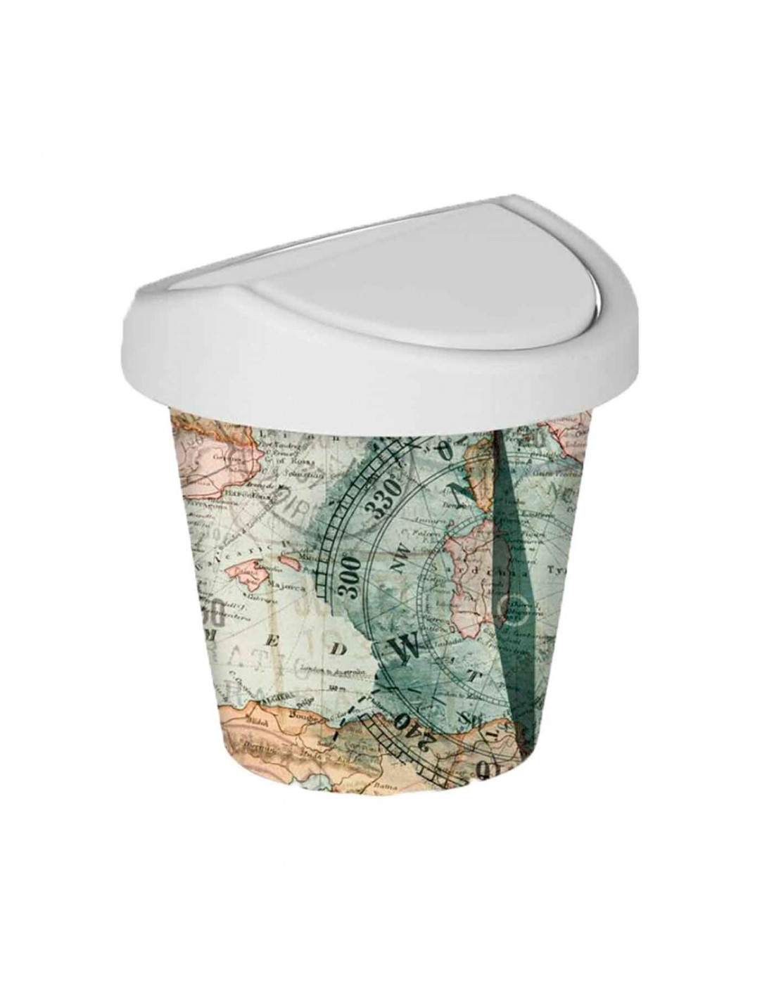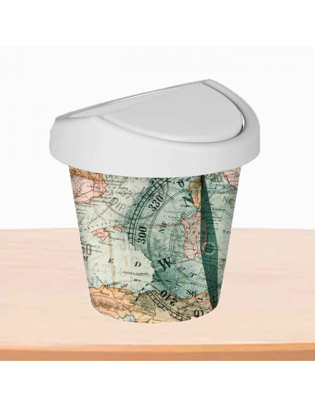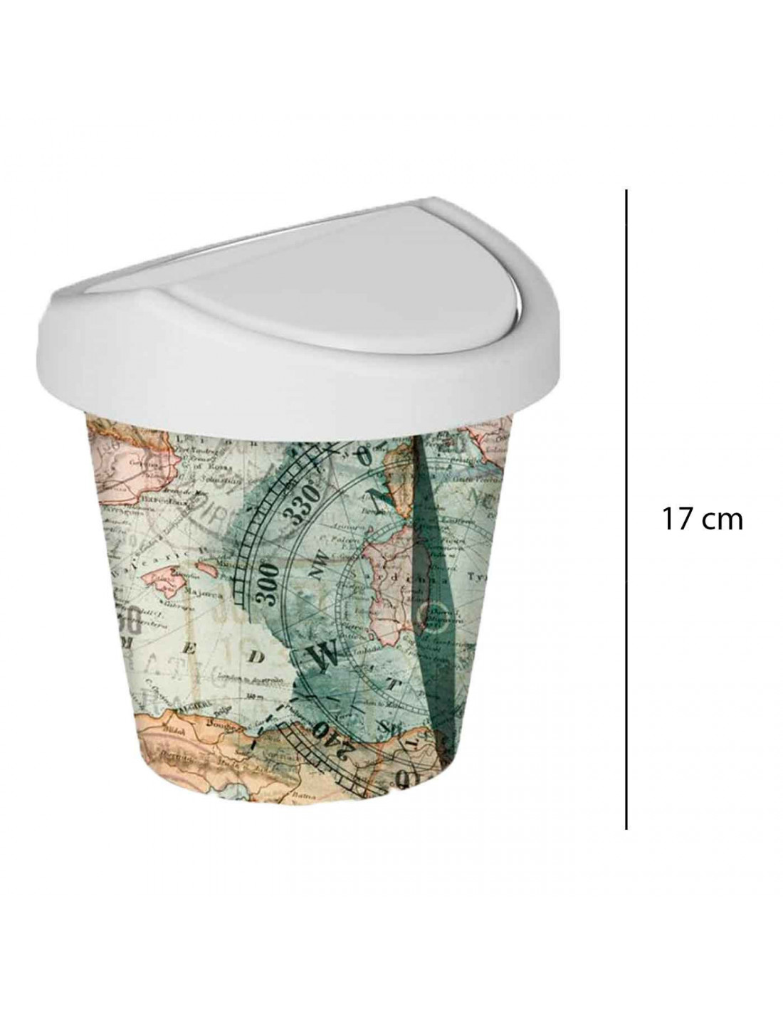 Mini papelera redonda con tapa giratoria de plástico con diseño de mapamundi. Oficina, escritorio, estudio. 17 x 16 cm