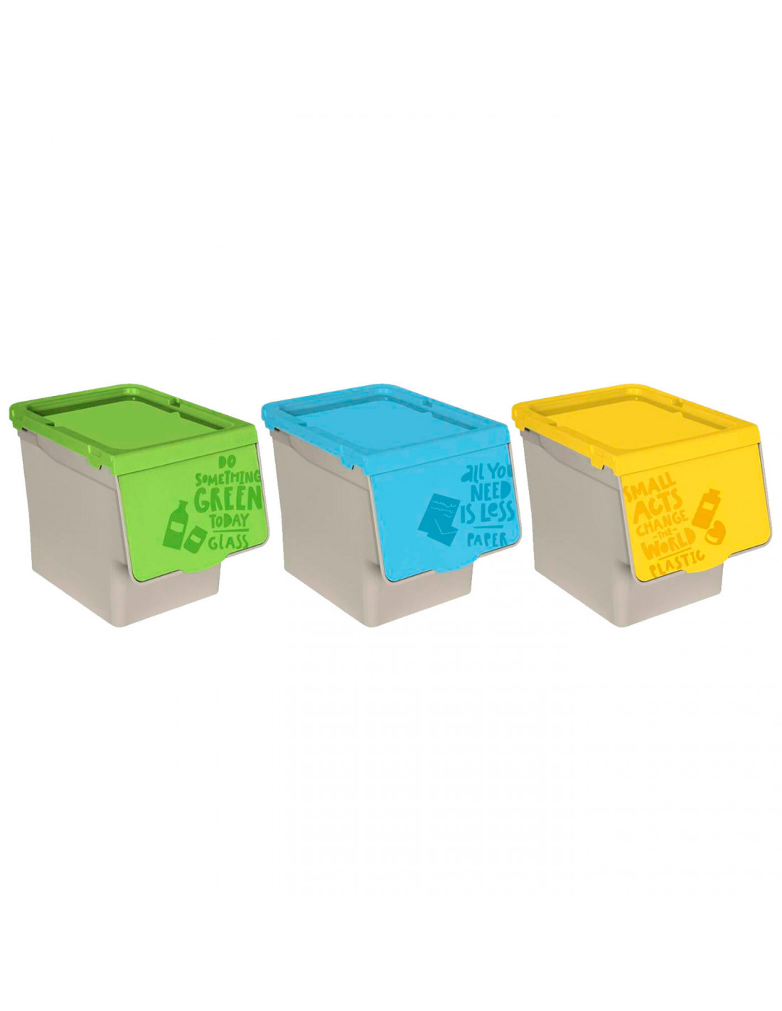 Tradineur - Pack de 3 contenedores apilables, polipropileno, cubos de basura, almacenamiento de residuos, fácil apertura, reciclaje (Papel, plástico y vidrio, 27 litros, 31,5 x 29,5 cm x 39,5 cm)