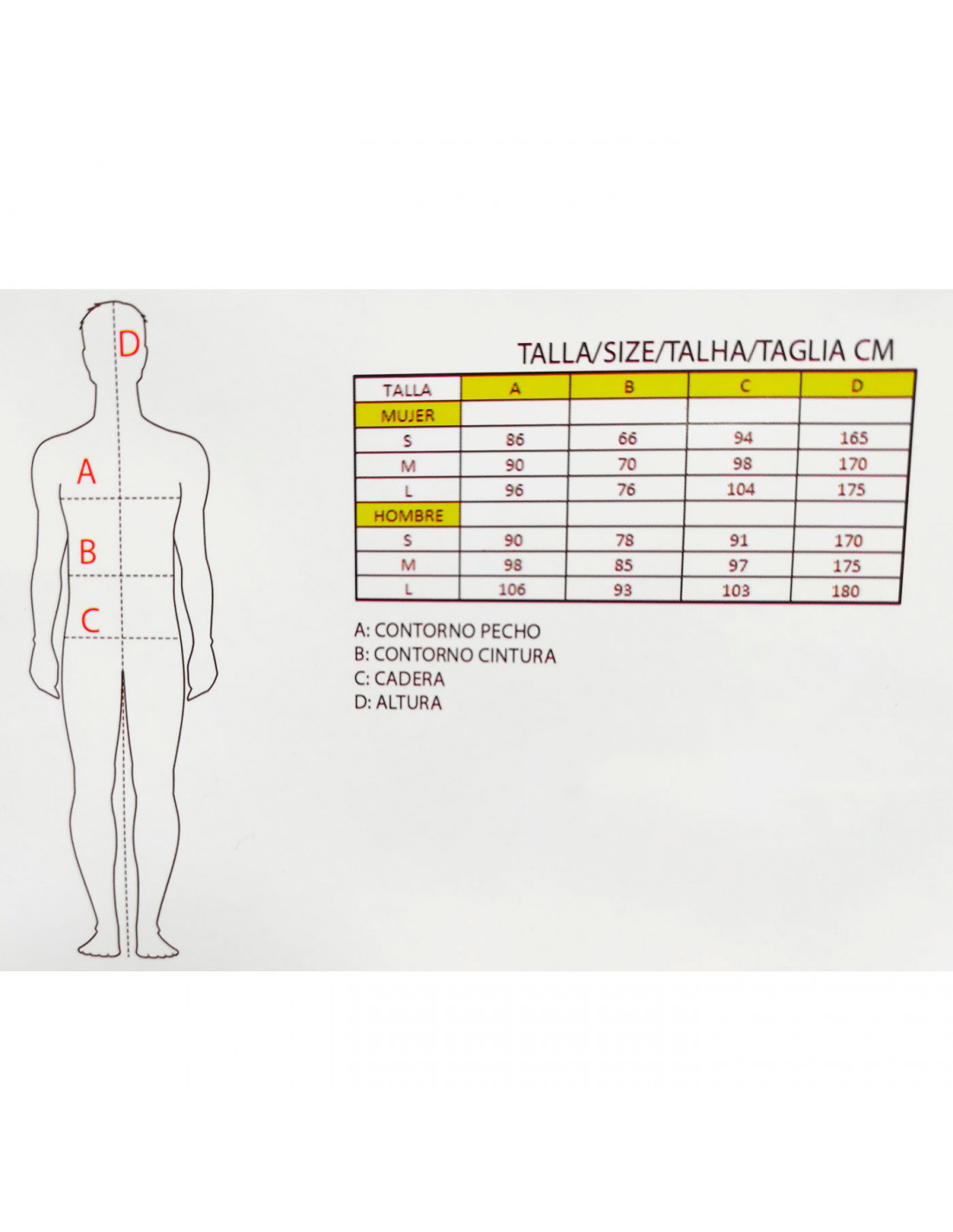 - Contorno del pecho: 96 cm (mujer) y 106 cm (hombre).