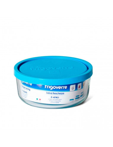 Tradineur - Fiambrera de cristal redonda, con tapa de plástico de 18 cm de diámetro y 7 cm de alto, con tapa azul. Recipiente para conservar alimentos con capacidad de 160 cl