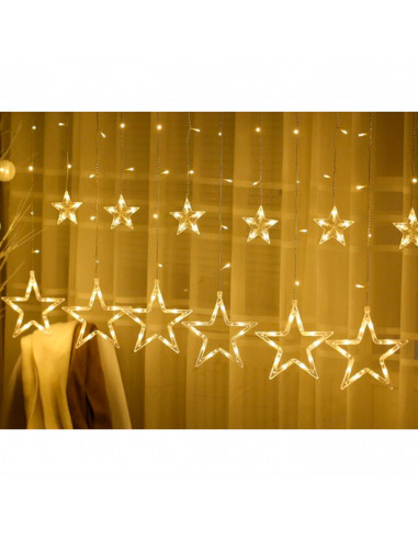 - Ambiente acogedor: esta cortina con 138 luces LED (entre ellas 6 estrellas de 19 cm y otras 6 de 8,5 cm) de tono amarillo cálido y potencia de 9W creará una atmósfera bonita y relajada, perfecta para ocasiones especiales como la Navidad, bodas, cumpleaños, etc