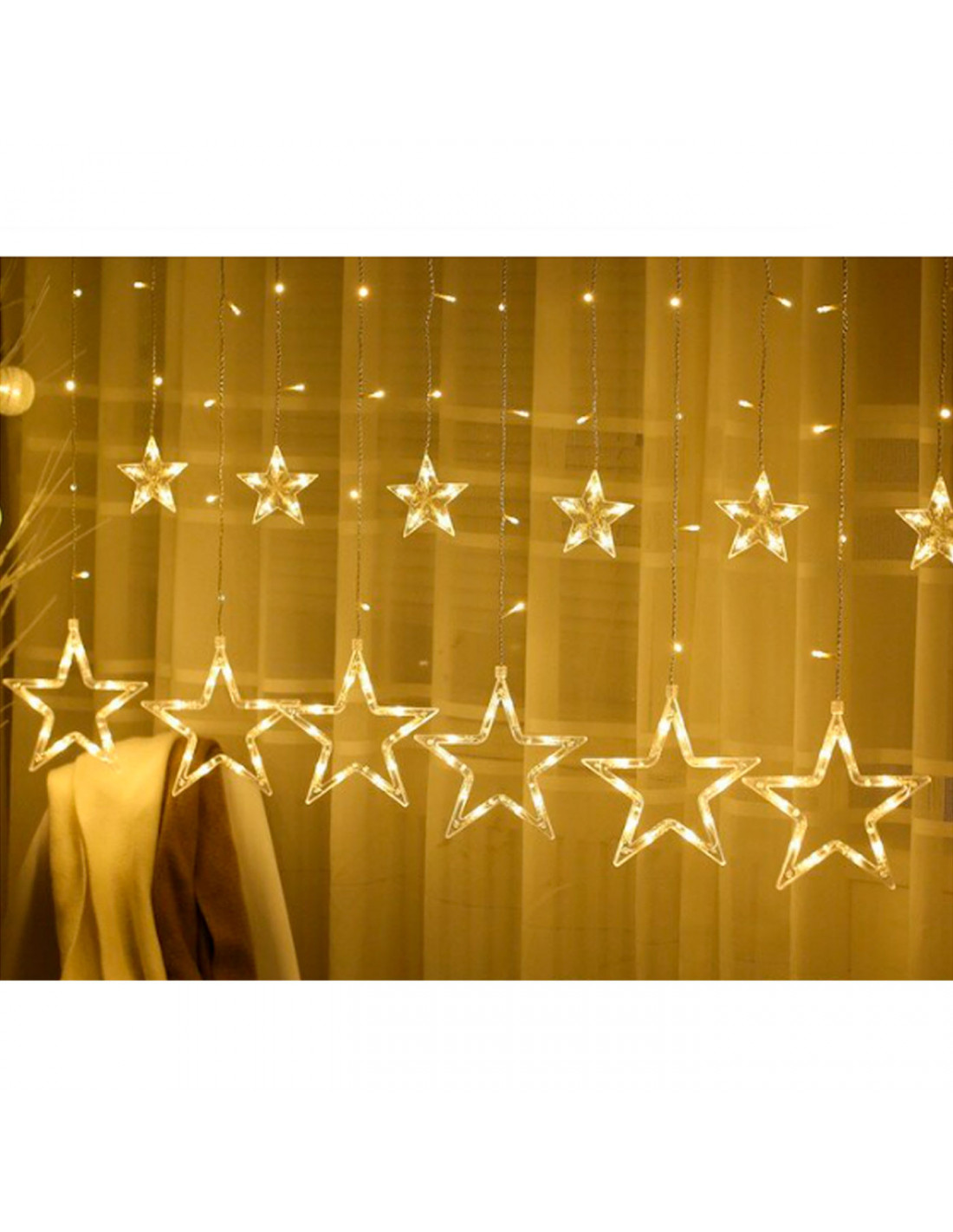 Decora tu hogar estas Navidades con esta preciosa cortina de luz LED con estrellas; sus 138 luces (entre ellas 6 estrellas de 19 cm y otras 6 de 8,5 cm) de tono amarillo cálido y potencia de 9W crearán un ambiente muy bonito y acogedor. La guirnalda mide aprox. 2,5 x 1 metro (largo x alto) + 1,5 más de cable. Está hecha de plástico y alambre de cobre de alta calidad que no se oxida. Podrás adaptarla fácilmente a espacios como escaparates, ventanas, paredes, etc.