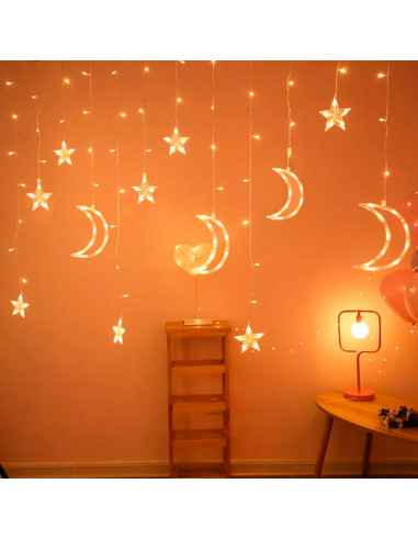 - Ambiente acogedor: esta cortina con 138 luces LED (entre ellas 6 lunas de 16,5 cm y 6 estrellas de 8,5 cm) de tono amarillo cálido y potencia de 9W creará una atmósfera bonita y relajada, perfecta para ocasiones especiales como la Navidad, bodas, cumpleaños, etc