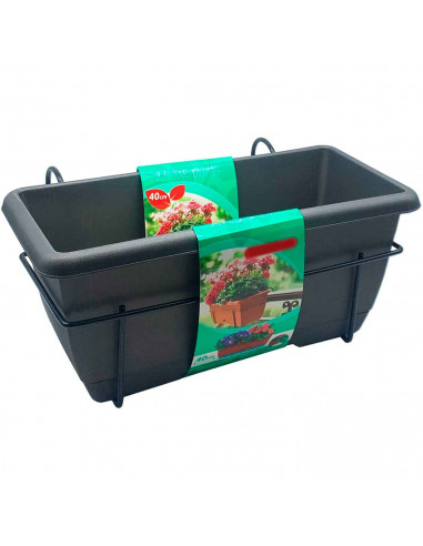 Tradineur - Jardinera para balcón con plato y soporte metálico, 40 x 19,5 x 17 cm. Macetero de plástico para colgar, 8L con plato integrado para agua (Gris Antracita)
