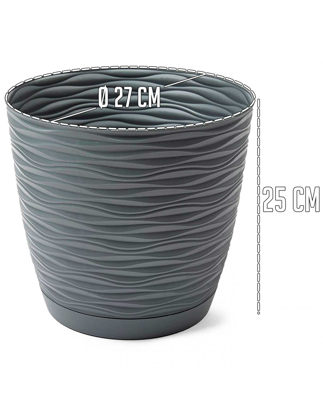 El tiesto está fabricado en polipropileno resistente y de gran calidad. Mide aprox. Ø 27 x 25 cm (Diametro x Altura). Incluye un plato integrado en la propia maceta en el que se acumulará el agua del drenaje y el cual se puede quitar para un fácil vaciado.
