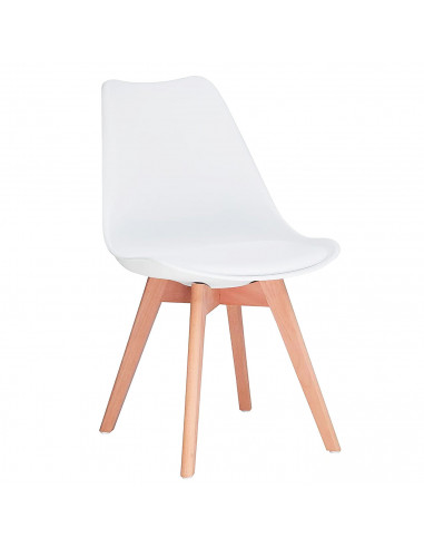 Esta bonita y práctica silla de estilo nórdico le dará un toque elegante y sobrio a cualquier estancia de tu hogar (comedor, sala de estar, etc). El asiento es de plástico rígido de color blanco y su forma es ergonómica. Se incluye un cojín para mayor comodidad. Las patas son de madera.