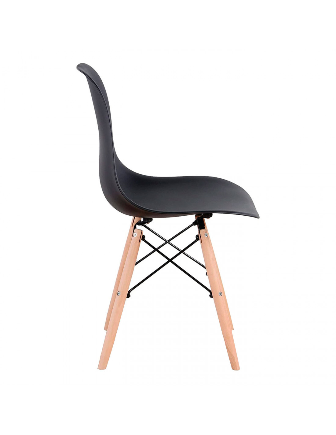 Esta bonita y práctica silla de estilo nórdico le dará un toque elegante y sobrio a cualquier estancia de tu hogar (comedor, sala de estar, etc). El asiento es de plástico rígido de color negro y su forma es ergonómica. Las patas son de madera y se unen mediante una estructura metálica.