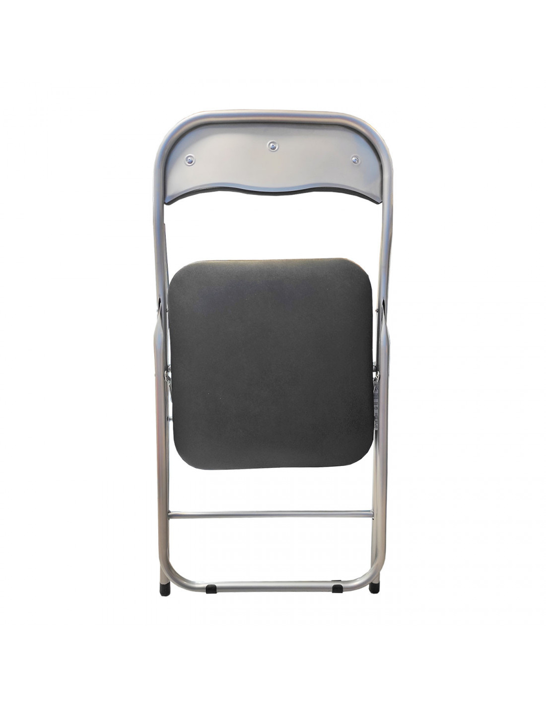 Esta bonita y práctica silla plegable te será muy útil tanto en tu hogar como en el jardín, terraza, patio e incluso para ir de camping o a la playa. Para una mayor comodidad, el asiento y el respaldo están recubierto de tela mullida y suave de color negro. El asiento tiene una superficie de 37,5 x 39 cm (ancho x profundo). El resto de la estructura es de metal de color gris y tiene conteras de goma antideslizantes en las patas. Cuenta además con reposapiés.