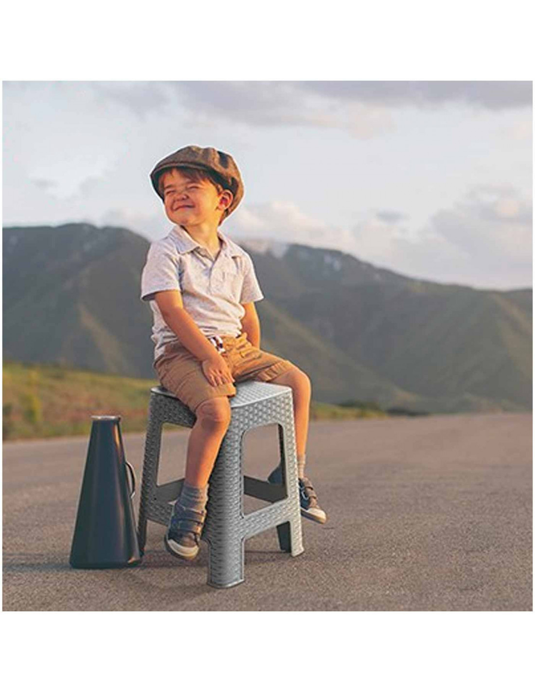 Este práctico taburete multiusos de plástico con un bonito diseño de imitación de mimbre te será muy útil para sentarte o también para usar como mesa improvisada. Es muy ligero e incluye una práctica asa en el asiento para poder moverlo cómodamente. Sus cuatro patas con reposapiés le aportan una gran estabilidad.