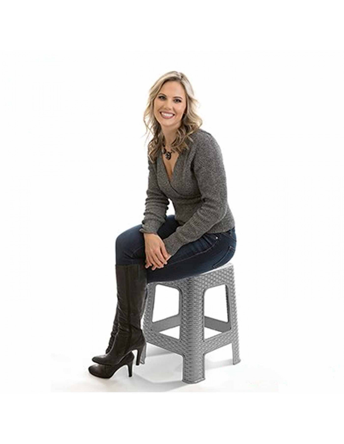 Este práctico taburete multiusos de plástico con un bonito diseño de imitación de mimbre te será muy útil para sentarte o también para usar como mesa improvisada. Es muy ligero e incluye una práctica asa en el asiento para poder moverlo cómodamente. Sus cuatro patas con reposapiés le aportan una gran estabilidad.