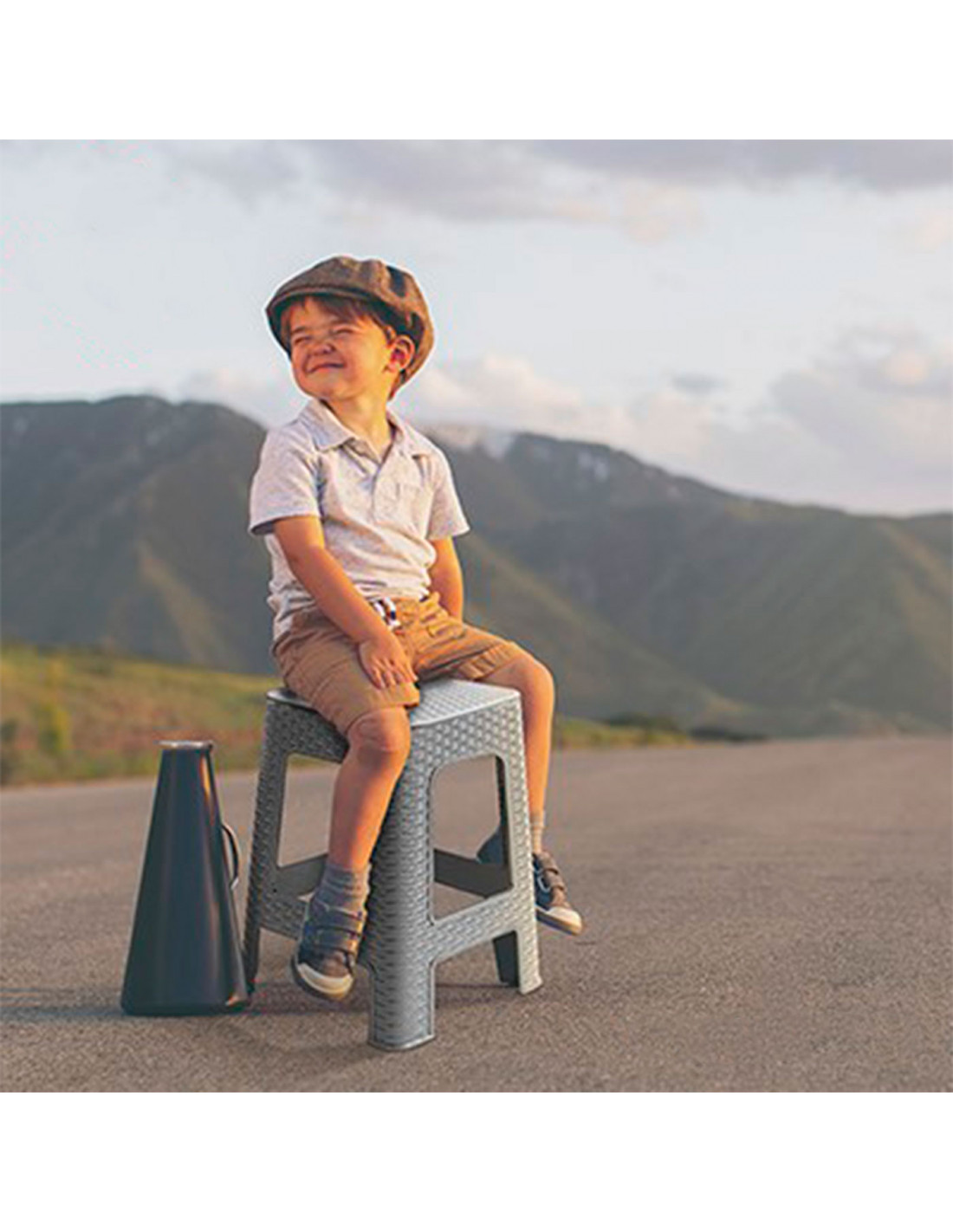 Este práctico taburete multiusos de plástico con un bonito diseño de imitación de mimbre te será muy útil para sentarte o también para usar como mesa improvisada. Es muy ligero por lo que se puede transportar fácilmente. Sus cuatro patas con reposapiés le aportan una gran estabilidad.