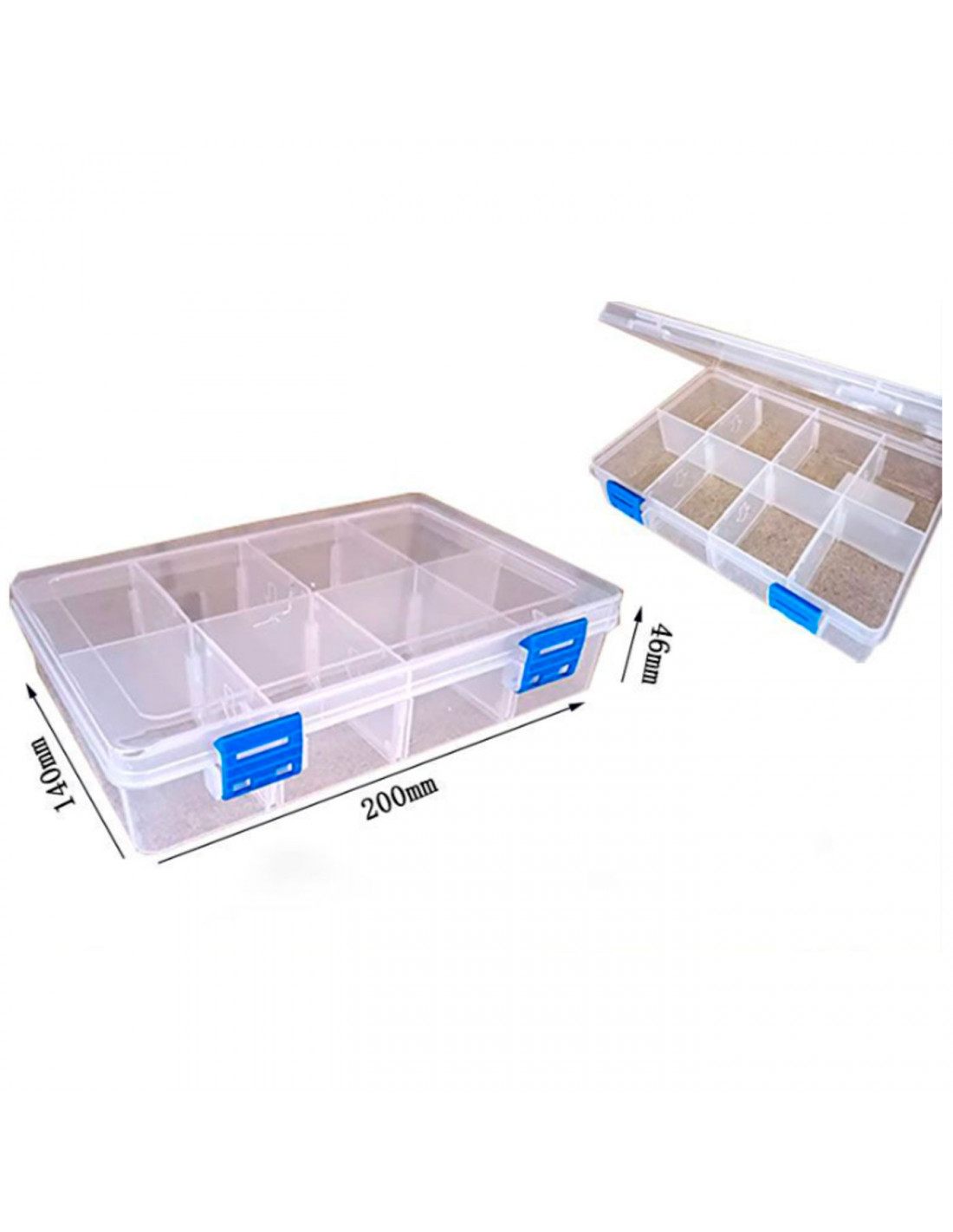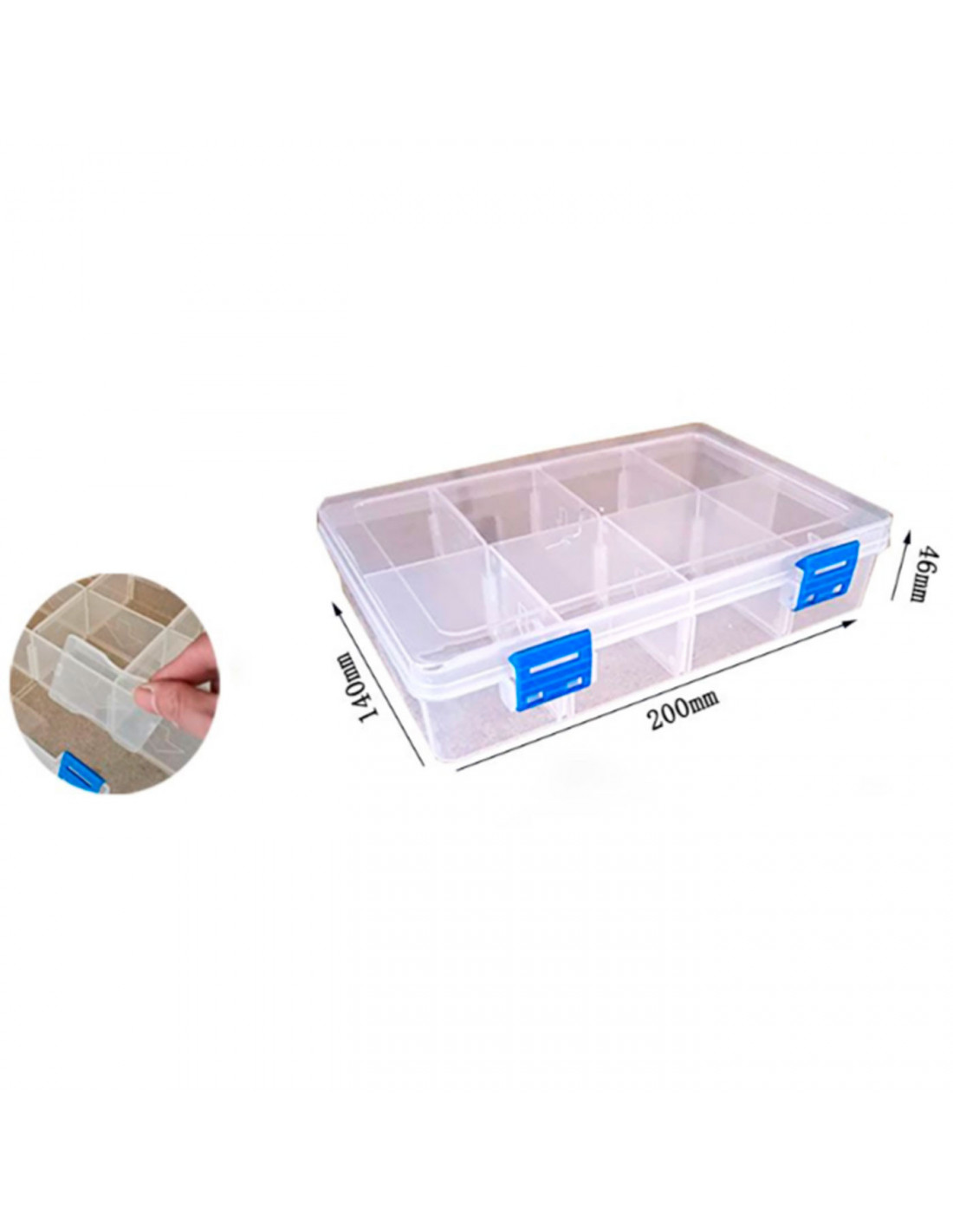 Esta práctica caja organizadora multiusos con un máximo de 8 compartimentos tiene un tamaño perfecto para guardar en ella todo tipo de objetos pequeños como accesorios de pesca, tornillos, tuercas, clips, hilos de costura, botones, etc. Está hecha de plástico transparente para poder ver claramente el contenido.