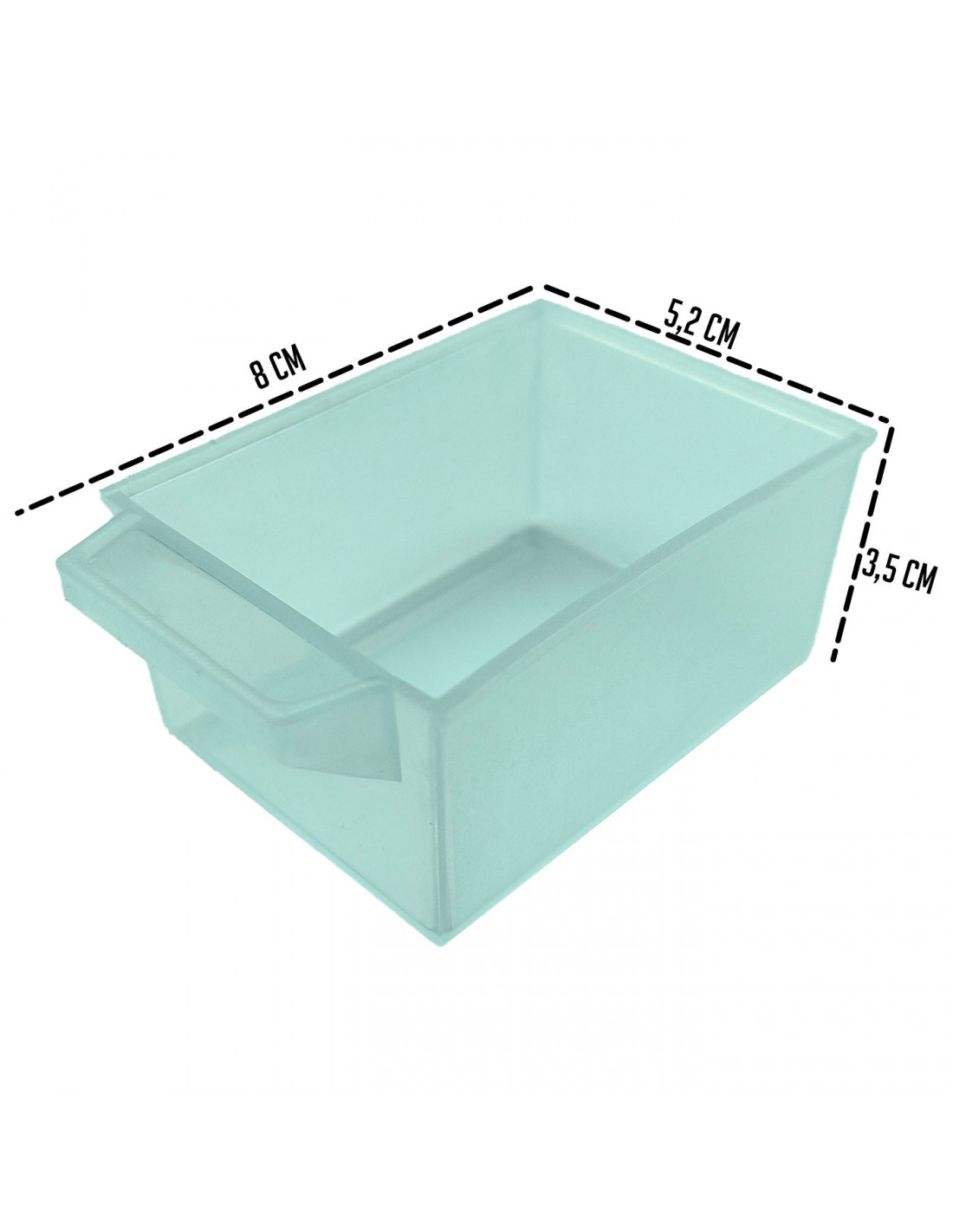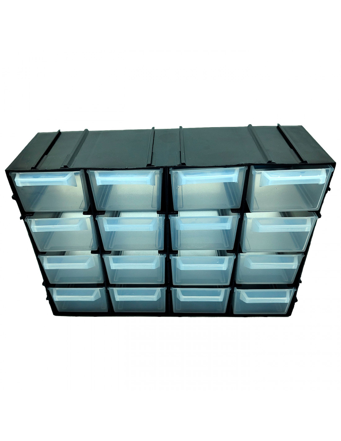 - 16 cajones transparentes de 3,3 x 4,8 x 6,6 cm cada uno aprox.