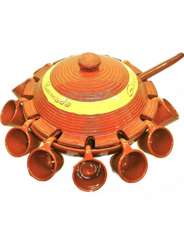 Juego de queimada de barro refractario, para disfrutar en compañía preparando esta bebida de tradicional Gallega. De acuerdo con la tradicción durante su preparación se debe recitar en voz alta un conjuro (conxuro) para espantar a los malos espíritus y a las meigas. Ideal para eventos y celebraciones, así como también en restaurantes tradicionales. también perfecto para decoración