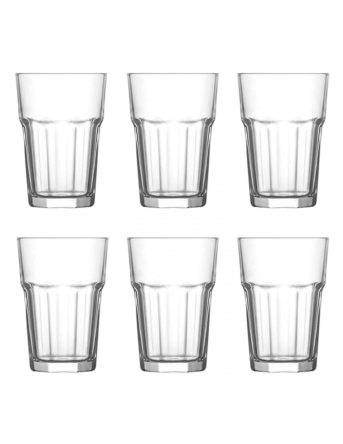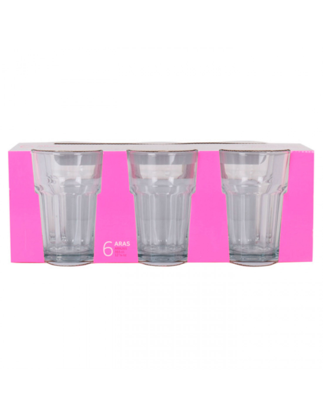 El pack consta de 6 unidades que cuentan con una capacidad de 365 ml. Cada vaso mide aproximadamente 12 x 8,3 cm (altura x diámetro superior) y son aptos para lavavajillas. El diámetro aproximado de la base es de 6 cm.