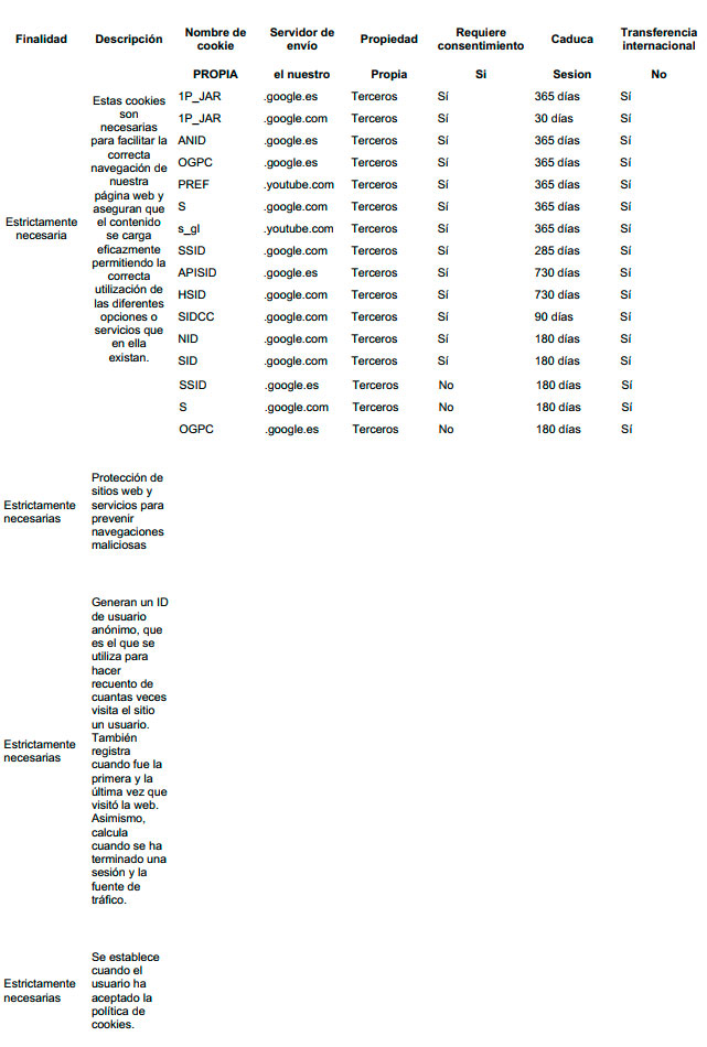 En la presente Política de Cookies encontrará la descripción y finalidad de cada una de las cookies utilizadas, así como el nombre del servidor desde donde se envían, su caducidad y en qué casos se produce transferencia internacional de datos.
